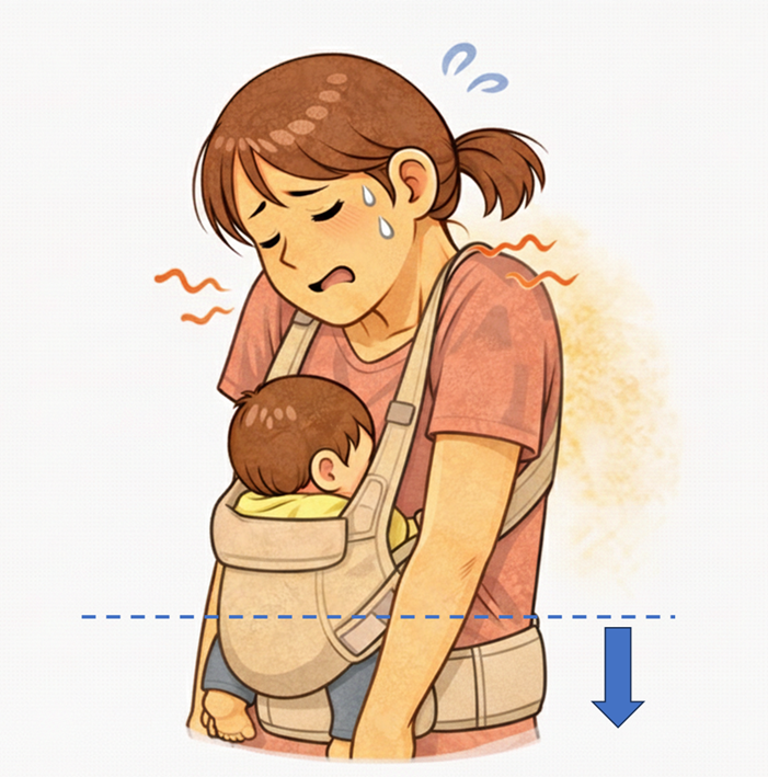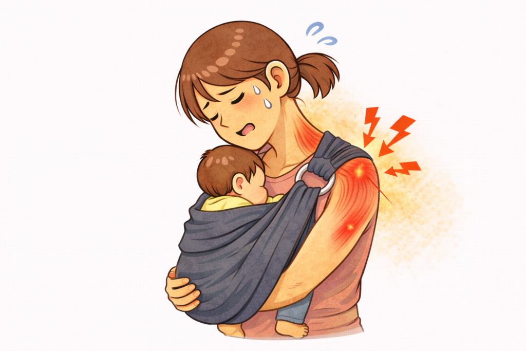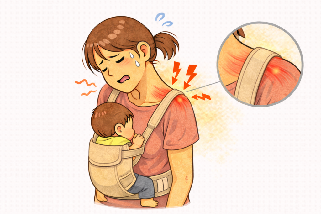 体型に合わない抱っこ紐は、無意識に肩をすくめる姿勢を作り、痛みを悪化させます。