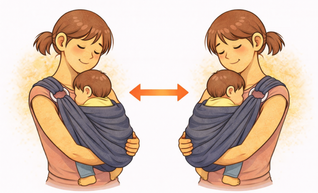 肩の痛みがある場合、無意識のうちに“楽な側”ばかりで抱っこしてしまいがちです。しかし同じ側に負担が集中すると、筋肉の緊張や炎症が長引く原因になります。片側で支える構造の抱っこ紐を使う時は、意識して左右交互に使うことで負担を分散でき、特定の筋肉や関節への過剰なストレスを防ぐことにつながります。