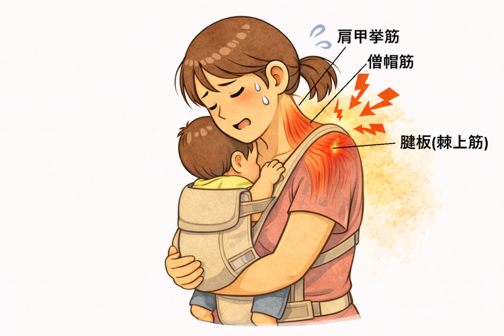肩ベルトが細い・クッションが弱い抱っこ紐では、その重さが僧帽筋・肩甲挙筋・腱板に集中し、筋肉の緊張や炎症を起こしやすくなります。
