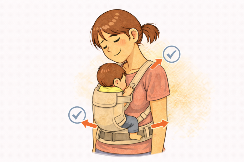 すでに肩に痛みがある状態で抱っこ紐を使う場合は、「選び方」だけでなく「使い方」も同じくらい重要です。どんなに体に合った抱っこ紐でも、使い方次第では症状を悪化させてしまうことがあります。