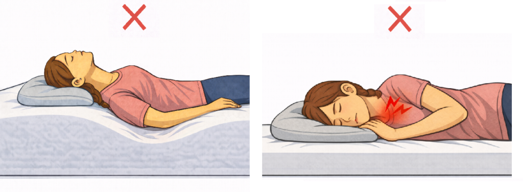 | 枕が低すぎる | 上側の肩が体の前方へ巻き込むように落ち、肩甲骨周りの筋肉が常に引き伸ばされ、関節内部の圧力を高めます。 |
