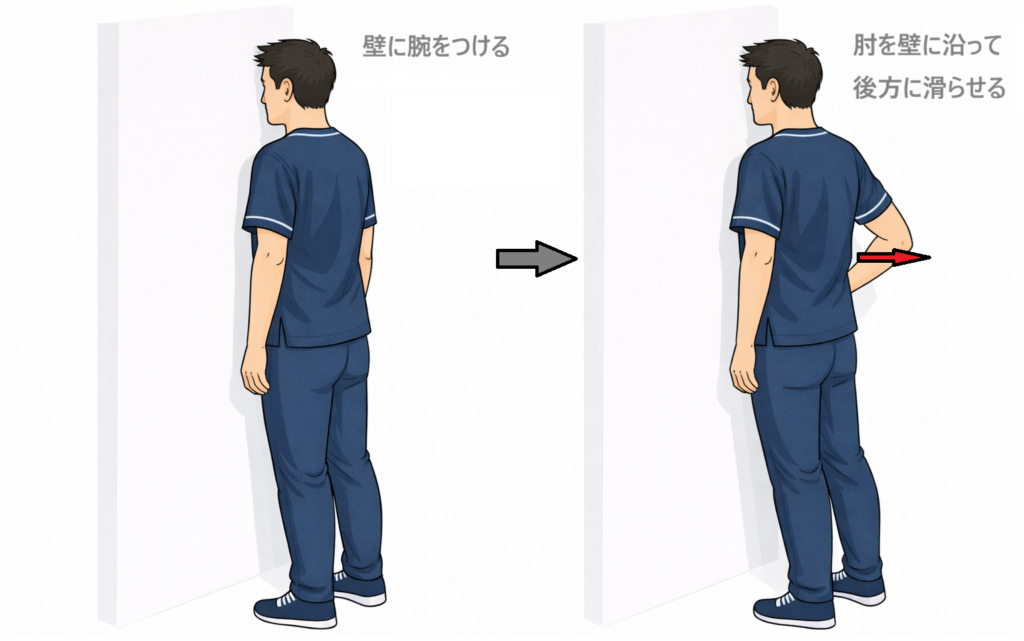 壁に体を近づけた状態で、 肘を後方へ引く練習を行います。内旋が痛い人は、腕ではなく“肘の位置”が原因で動きにくくなっていることが多いため、壁を使って姿勢を安定させながら練習します。