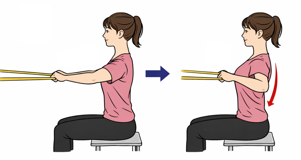 背筋を伸ばして肩甲骨どうしを寄せるようにゴムを引くと、肩甲骨と体幹の運動になる