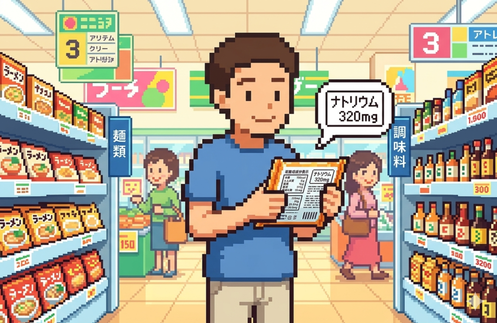 塩分過多の主な原因は、意外にも「自覚のない塩分」です。冷凍食品・缶詰・レトルト食品・ファストフード・コンビニ弁当には、1品で2〜3gの塩分が含まれることが珍しくありません。食品表示の「食塩相当量」を確認する習慣をつけることが大切です。また脂質異常症を合併している場合は、加工食品の飽和脂肪酸にも注意が必要です。