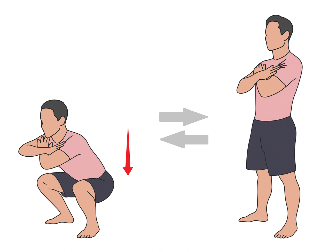 - スクワット:10〜15回 × 2〜3セット(体を少し前傾させて、痛みがない範囲で膝を曲げて行う)