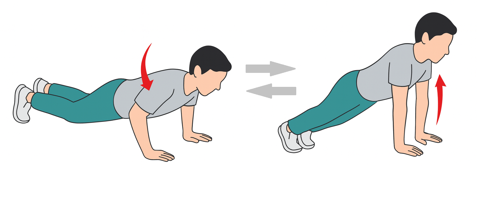 腕立て伏せ:8〜15回 × 2〜3セット(背中が丸まったり沿ったりしないように行う) - 頻度:週2〜3回
