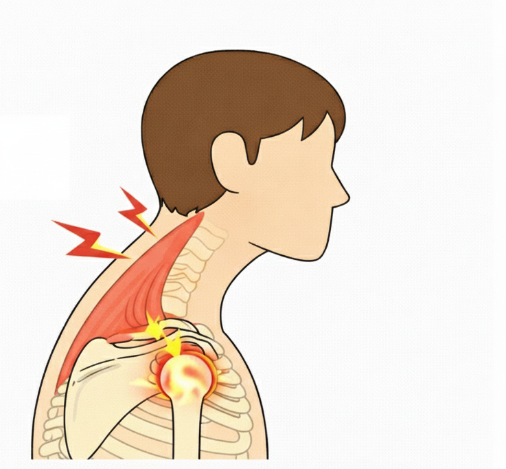 頭が前に出ると、僧帽筋や肩甲挙筋が常に緊張し、 肩こり・肩痛につながります。